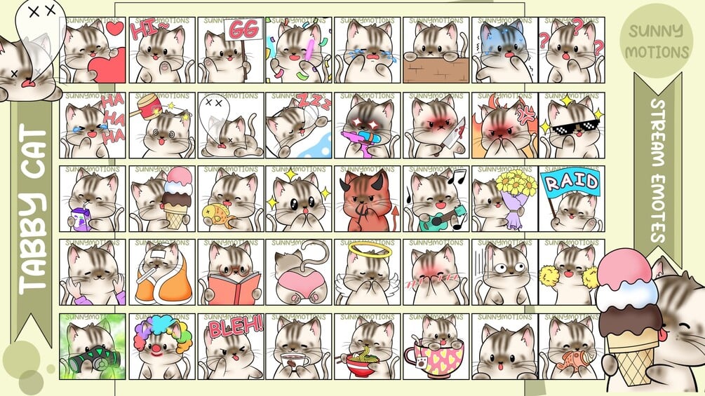 40x Tabby Cat Emotes / Twitch Emote / Discord Emote, Cute Kawaii Chibi Style Kitty Twitch Emoji / Kitten Emote Pack, Meow Emotes For Streamer